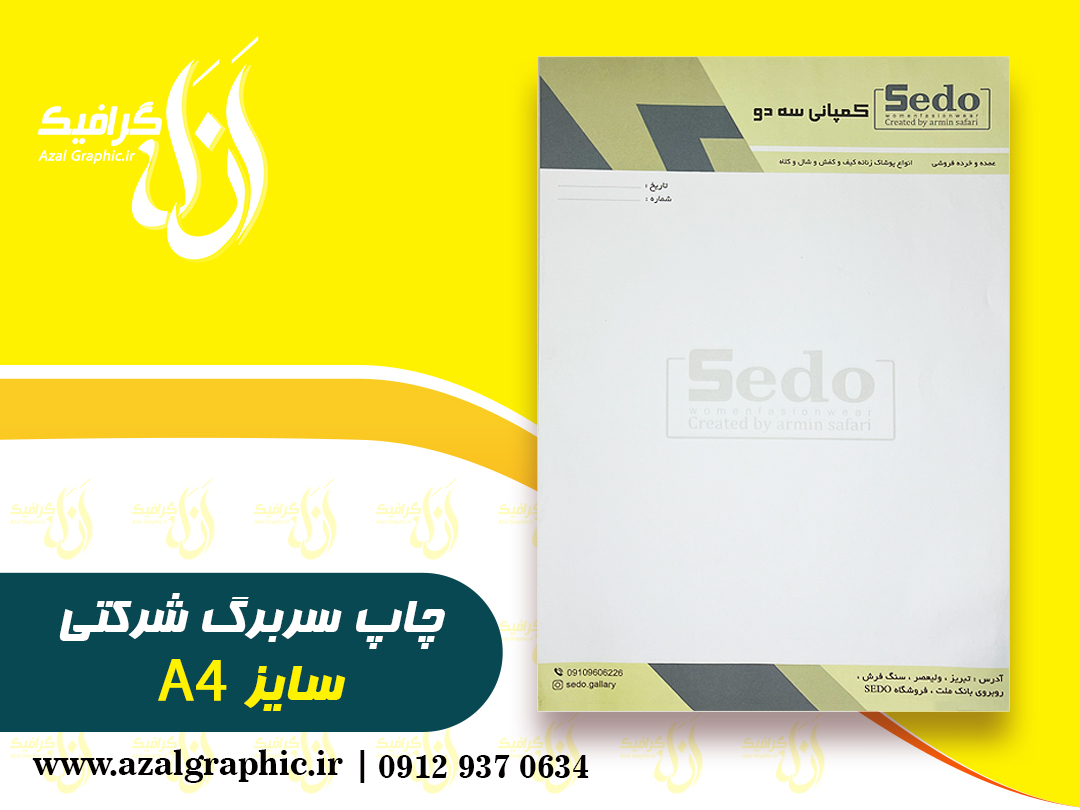 - نوع چاپ: چاپ سربرگ در فرم عمومی بصورت تمام رنگی بوده و طرح های تکرنگ و 2 رنگ هم در همین فرم با همان قیمت چاپ میشود.